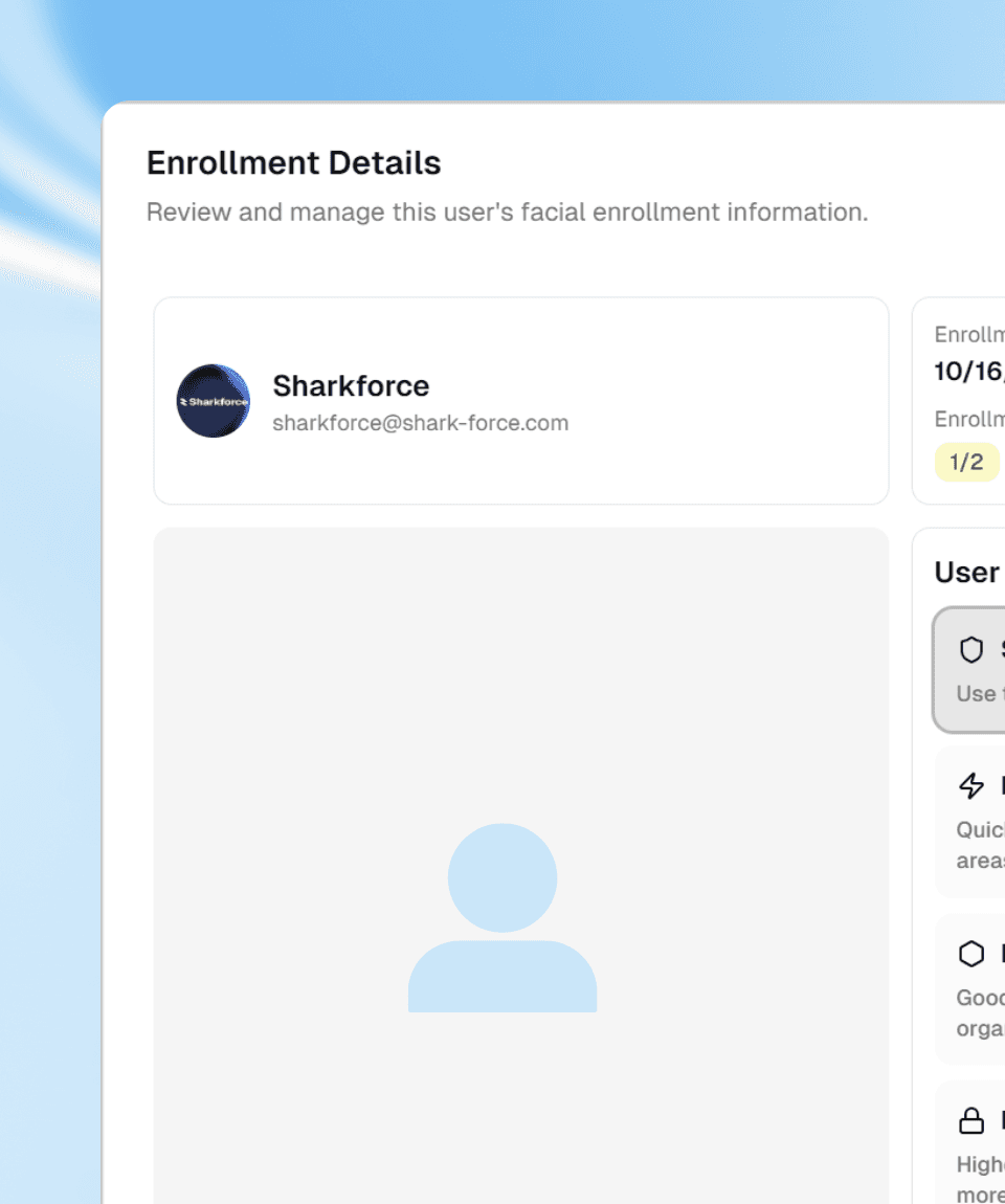 Sharkforce verifies identity in under 2 seconds using military-grade facial recognition. No badges to lose. No PINs to share. No buddy punching. Just your face.