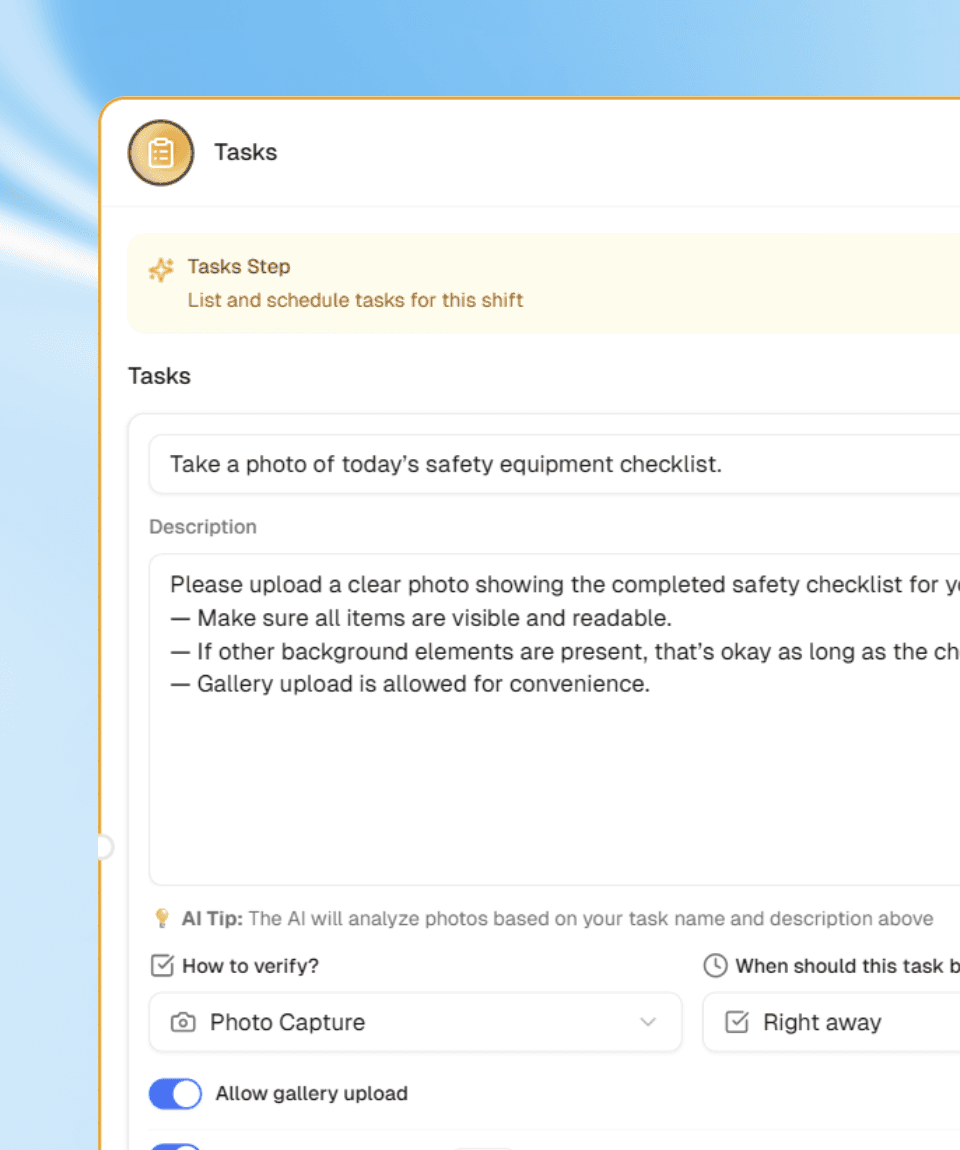 Smart photo hints guide every submission, giving employees instant feedback on what good proof looks like.