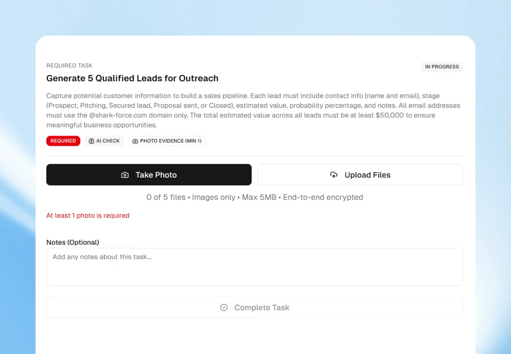 Instead of managers manually reviewing photos and files, Sharkforce AI checks every submission against your policies, locations, and timestamps, auto-approving clean work and flagging risky or incomplete tasks in seconds.