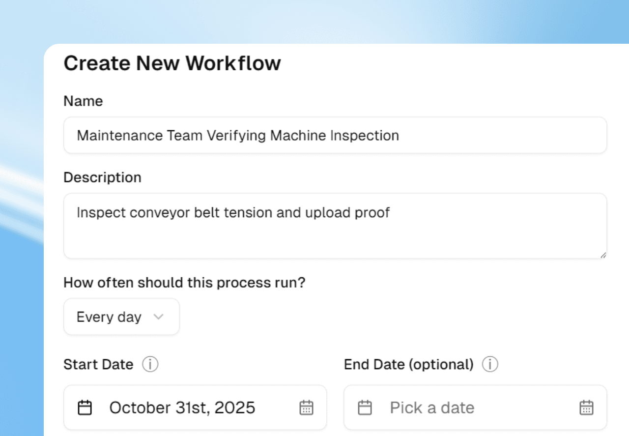 With automatic validation, your maintenance team can focus on doing the work, not chasing paperwork. For instance, our maintenance inspection workflow: